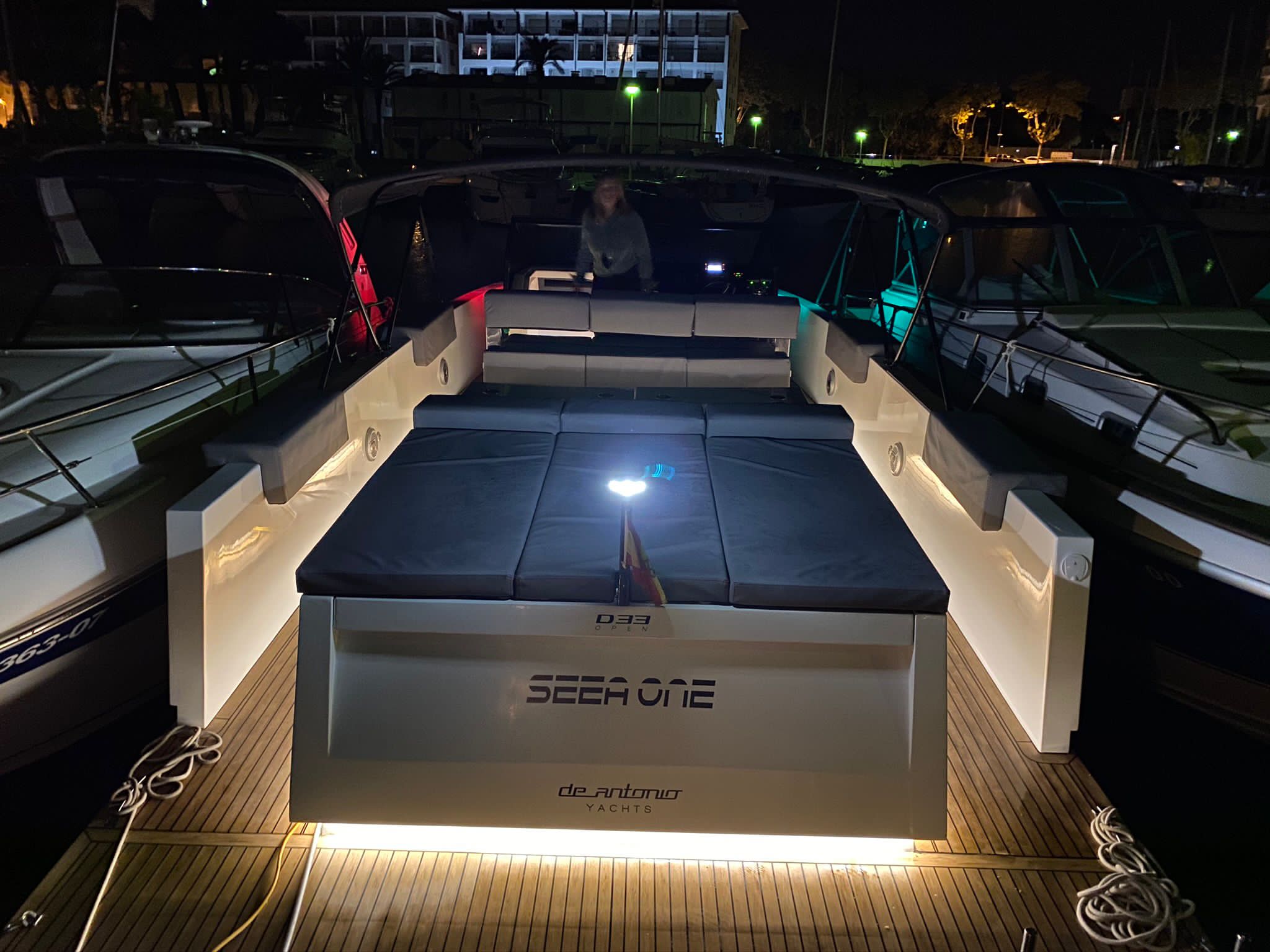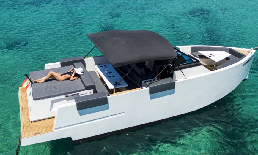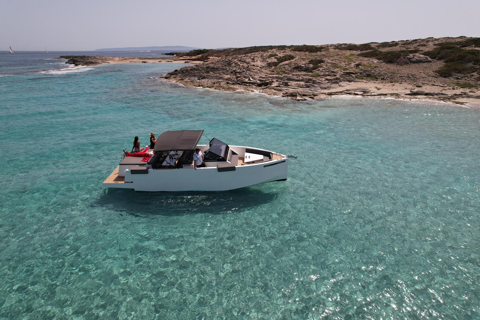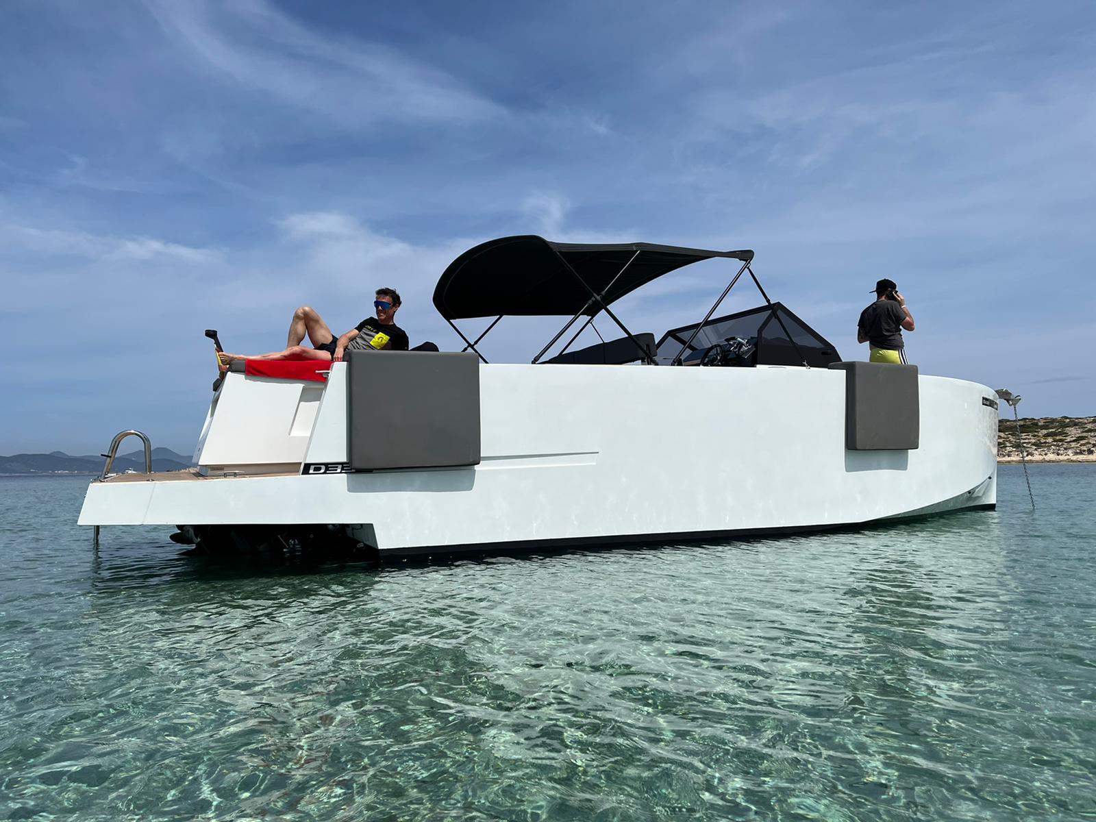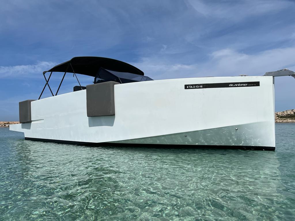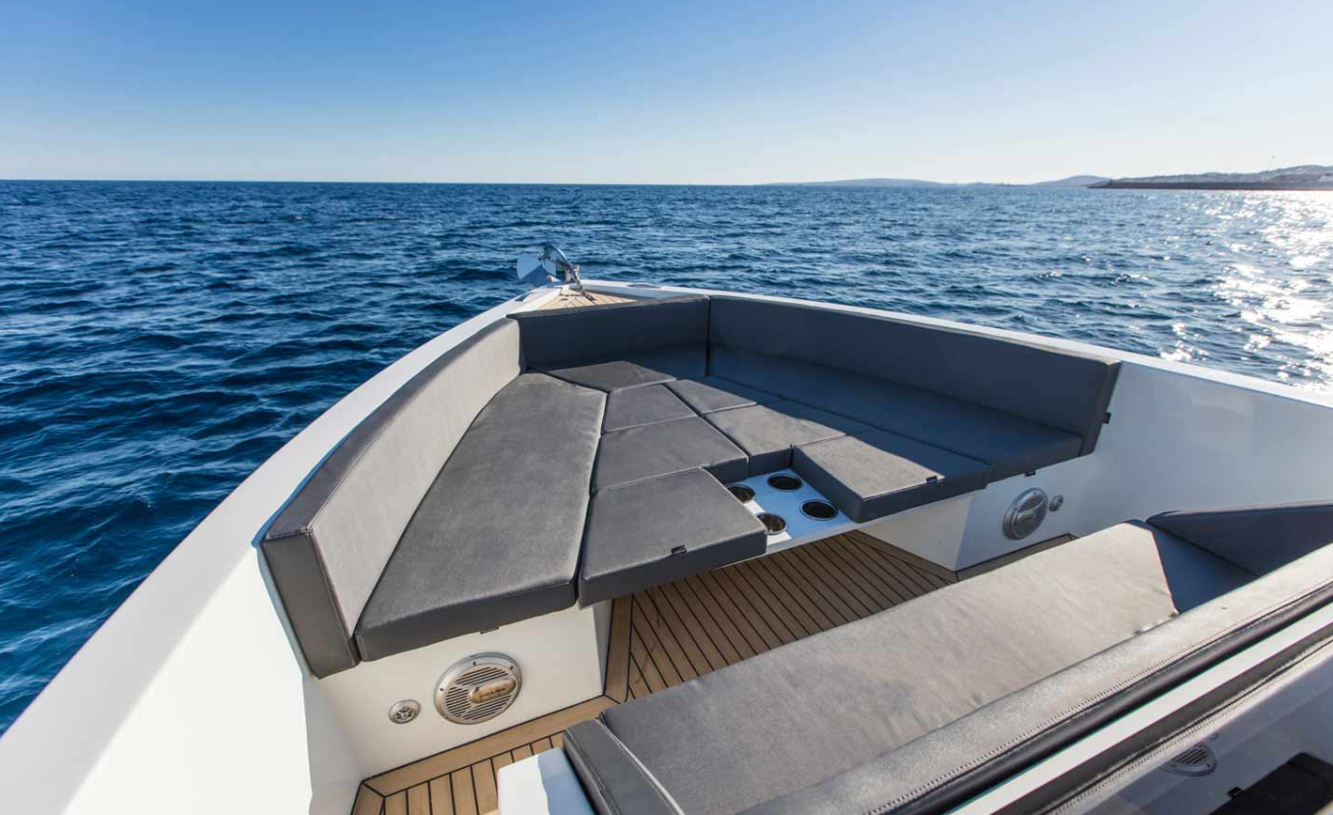 Una lancha muy versátil de 11 metros de eslora, con capacidad autorizada para 10 plazas (9 invitados + patrón). 33 Open entra en la linea de yates de diseño y estilo moderno con líneas puras como VanDutch, Vanquish, Pardo, Absolute … Su actual color del casco y sus líneas estéticas te convertirán en el centro de atención de todos los yates en tu día de navegación.