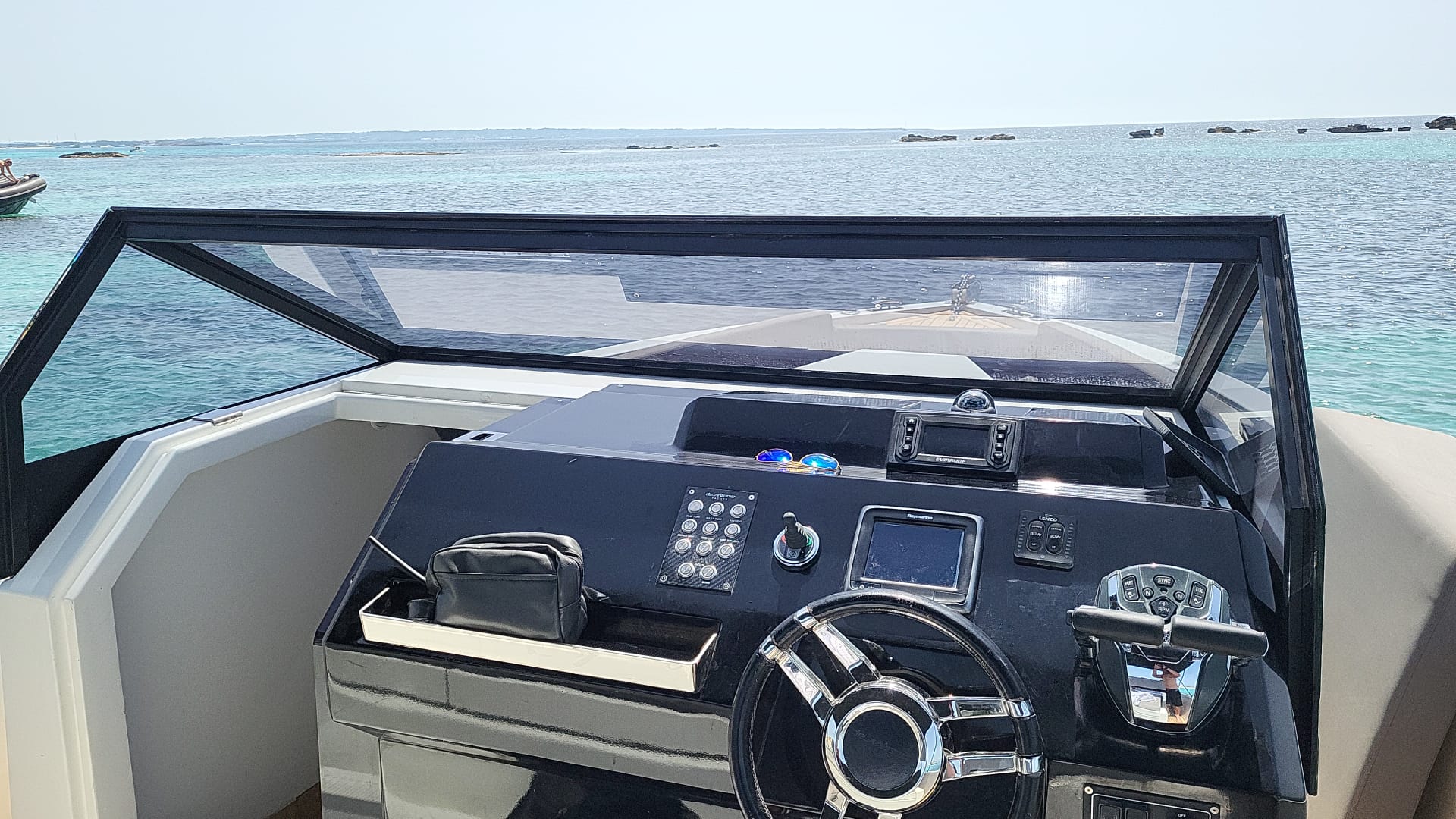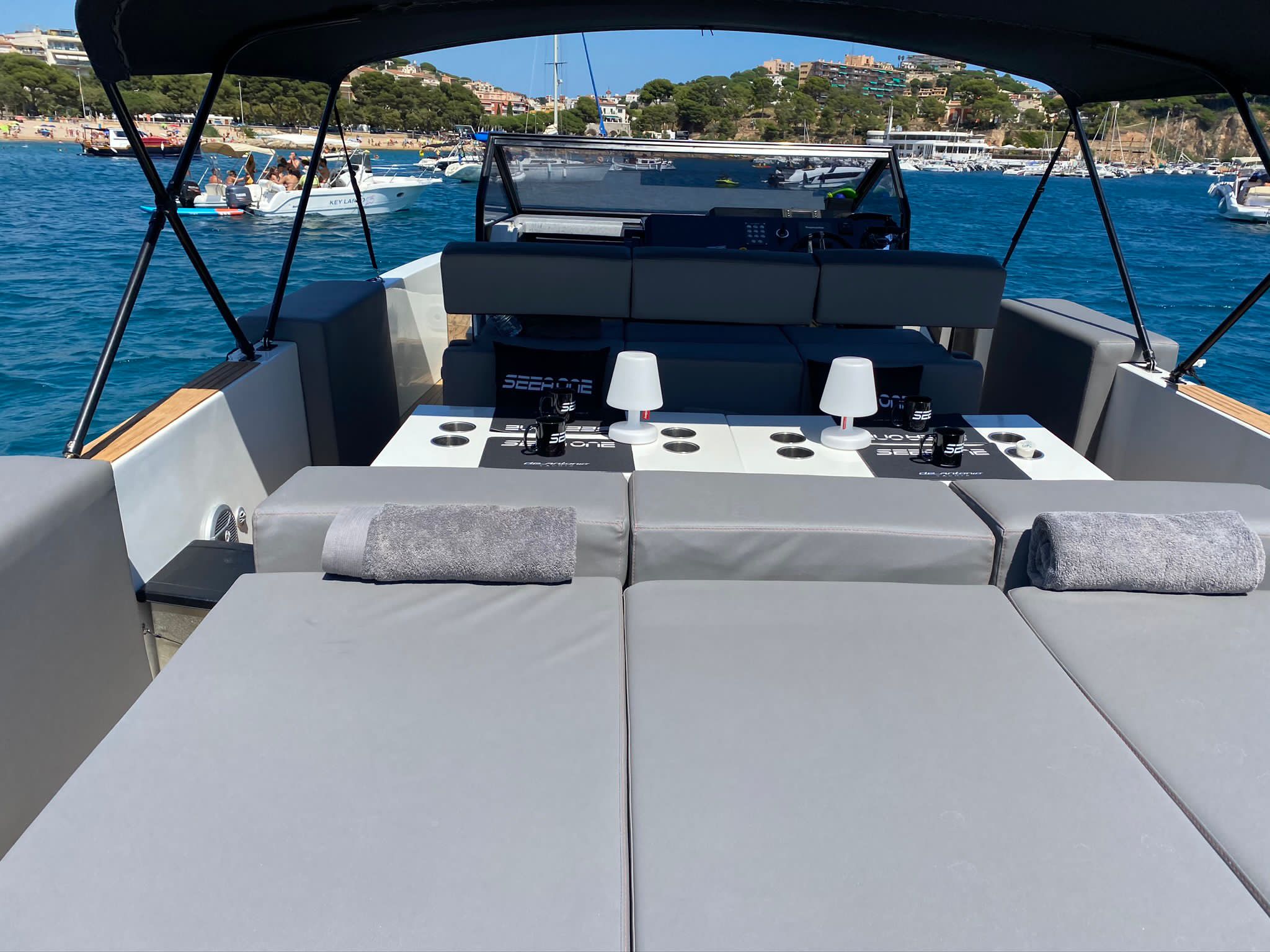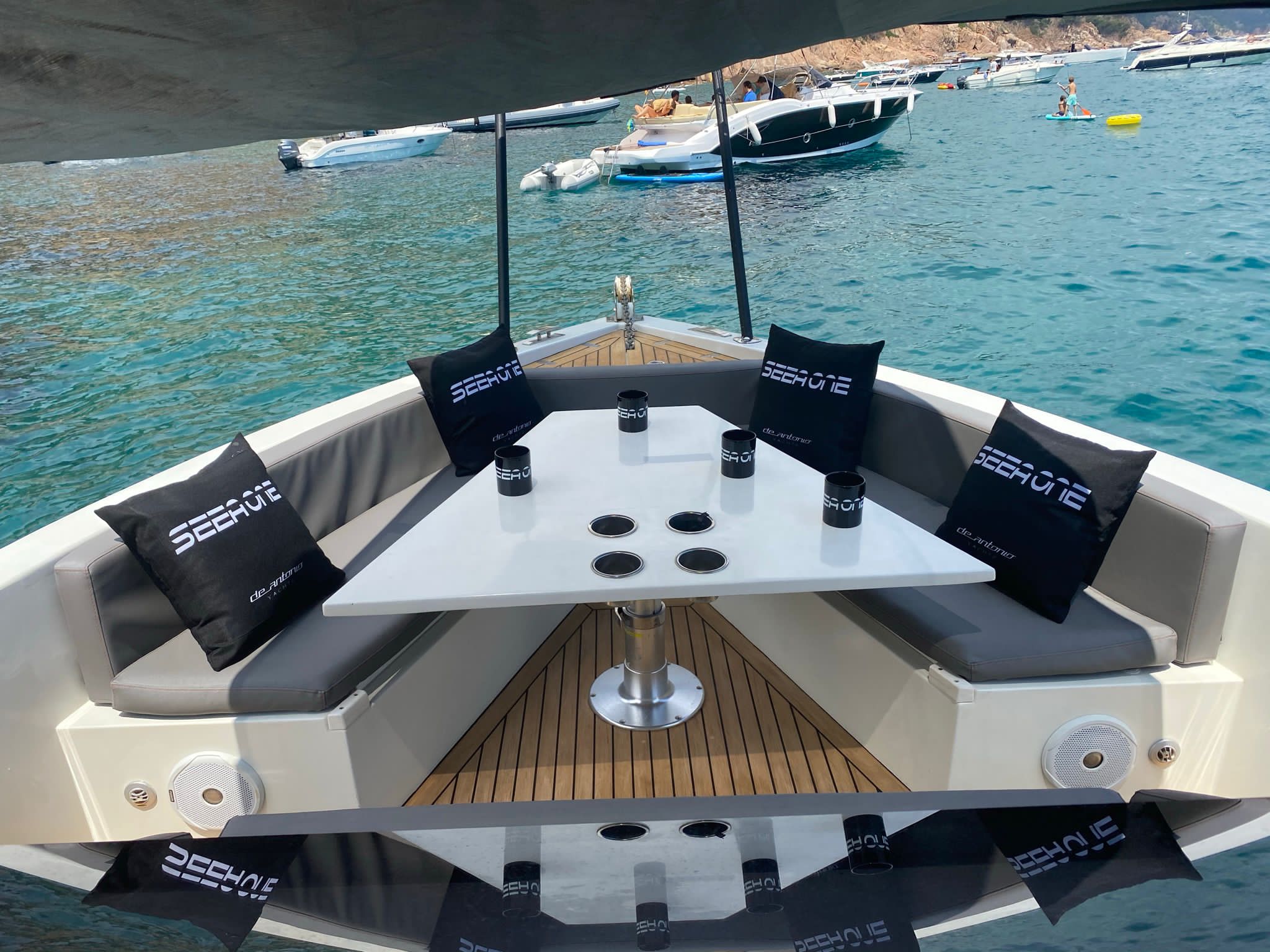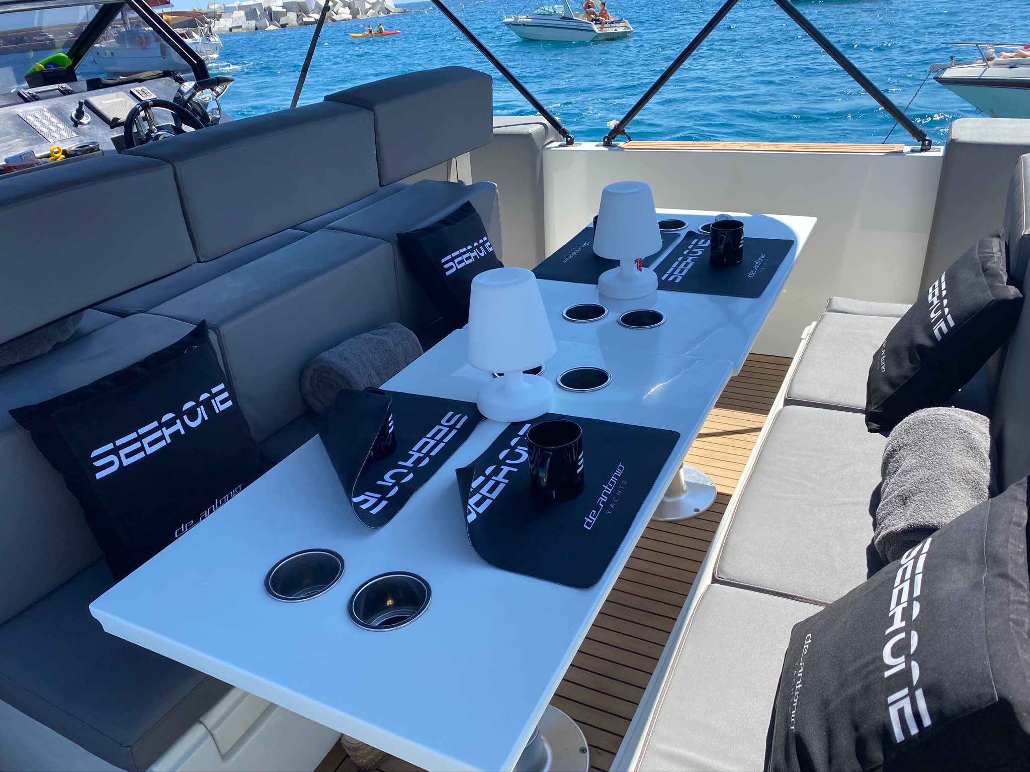 Empezando por la parte trasera de la embarcación encontraréis la plataforma de baño, con ducha y escalera para facilitar el acceso a la embarcación. En popa ofrece un solárium amplio para disfrutar al máximo del sol y las vistas. Unido al solárium de popa un sofá orientado hacia proa con dos mesas retráctiles, muy prácticas para preparar un cóctel o picnic a bordo durante los fondeos antes de bajar al restaurante. En la zona de pilotaje además del asiento del piloto encontraréis otro asiento desde el que los demás tripulantes podrán disfrutar y conversar con el piloto durante la navegación. El control de mandos está diseñado con acabados en piel y cromados. Desde esta zona se tiene acceso al camarote, con baño completo.