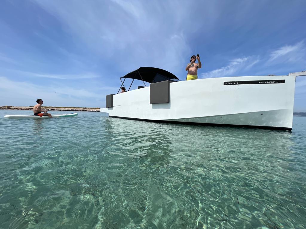 En el interior de esta espectacular lancha de diseño disfrutaréis de un camarote con dos camas individuales con la posibilidad de juntarlas para crear una doble, y un baño completo. En cuanto a la motorización, la 33 dispone de dos motores con los que poder alcanzar una velocidad de crucero de 25 nudos, velocidad perfecta para descubrir todos los rincones de la isla de Ibiza con una navegación cómoda, segura y un consumo eficiente de combustible.
