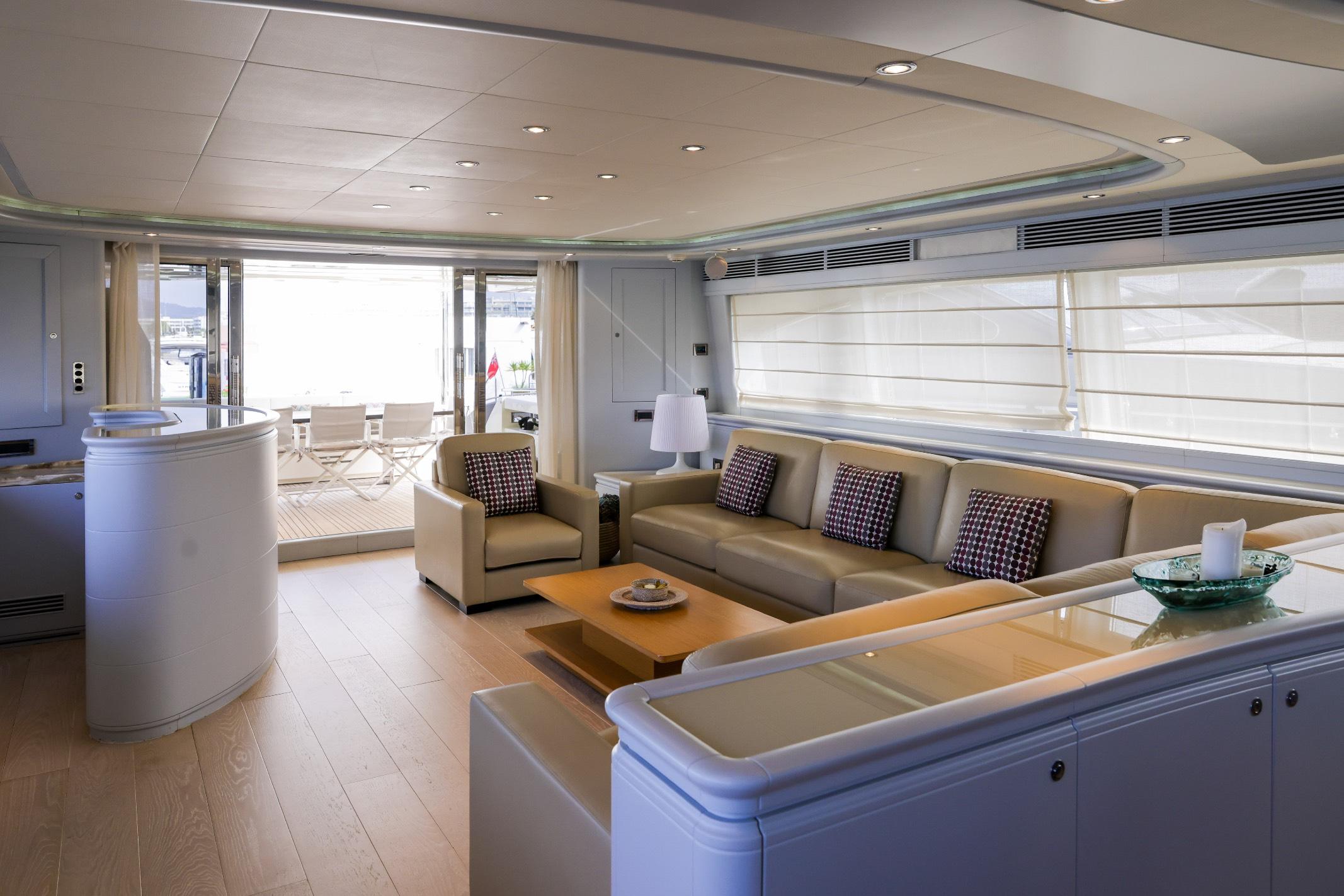 Su amplio salón y sala de estar con comedor, lounge con bar, televisión y equipo de música lo convierten en el yate perfecto para entretenerse y relajarse. Los tonos cálidos y el mobiliario suntuoso se encuentran en todo el yate, creando un ambiente relajante y acogedor. En cuanto a las áreas exteriores, CAMARIK ofrece un generoso flybridge con solárium, comedor y bar, lo convierte en el yate perfecto para reuniones, celebraciones o simplemente para relajarse bajo el sol. También es capaz de llevar hasta 6 tripulantes a bordo para garantizar una experiencia chárter relajada.